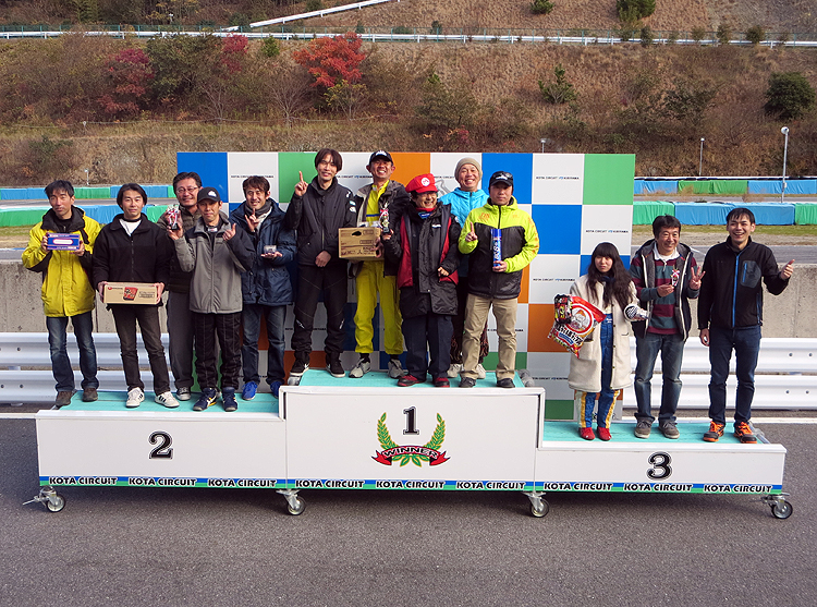 2017年だれでも軽四耐久お楽しみ走行会 Round.3 軽四Gクラス 表彰台 優勝:No.36「ブリッド谷口G早川水道トゥデイ」のみなさん(上段中) 2位:No.63「WMS☆NANKA-R☆アルト」のみなさん(上段左) 3位:No.56「MMM WP トゥデイ 2号」のみなさん(上段右) 4位:No.8「セキグチカーズESSE」のみなさん(下段) |